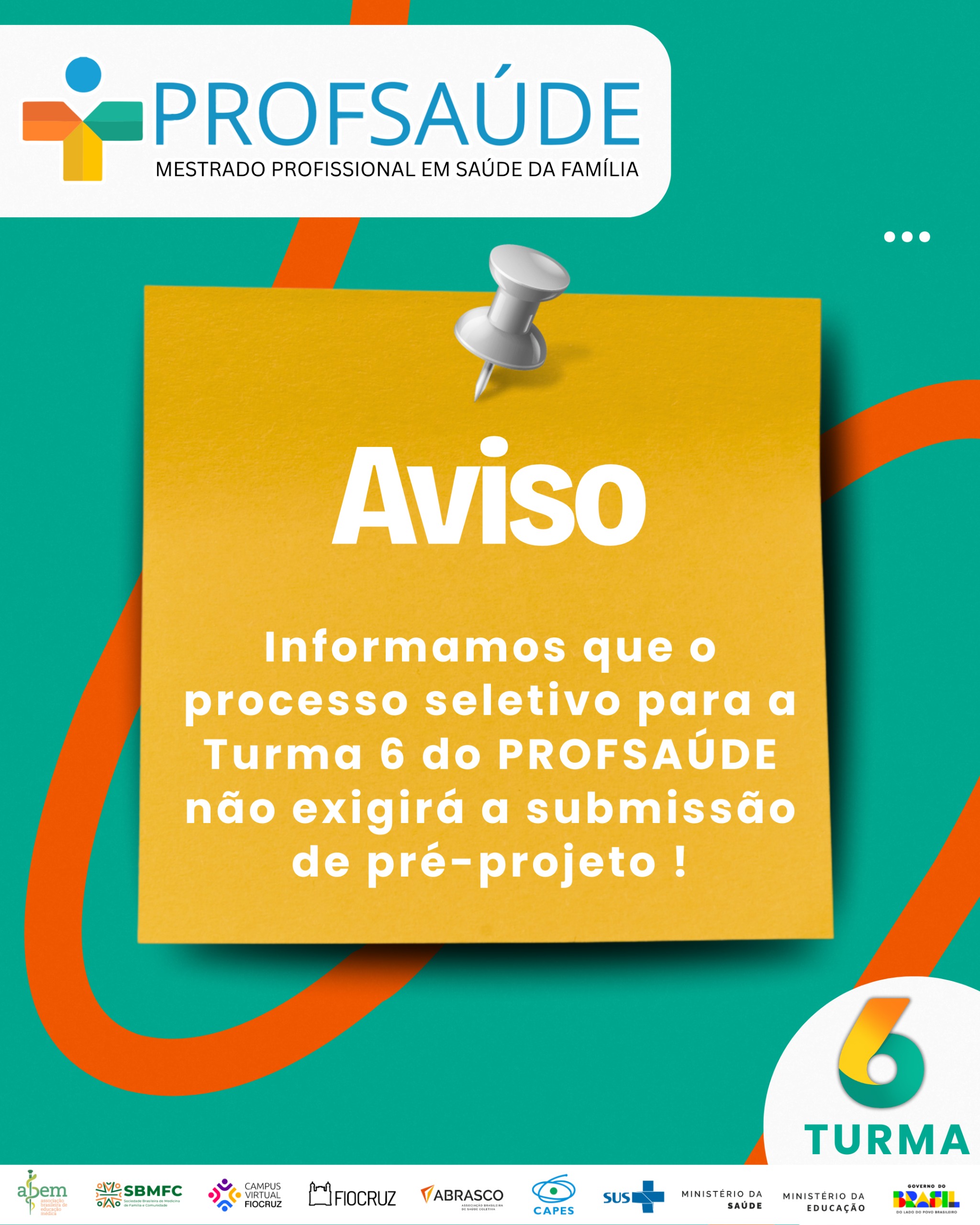 Processo Seletivo – PROFSAÚDE Turma 6 Postado em 28 de janeiro de 2026 por redator ufpel Postado em Sem categoria As inscrições podem ser feitas até o dia 06 de março de 2026, através do formulário disponível em https://shorturl.at/958wJ