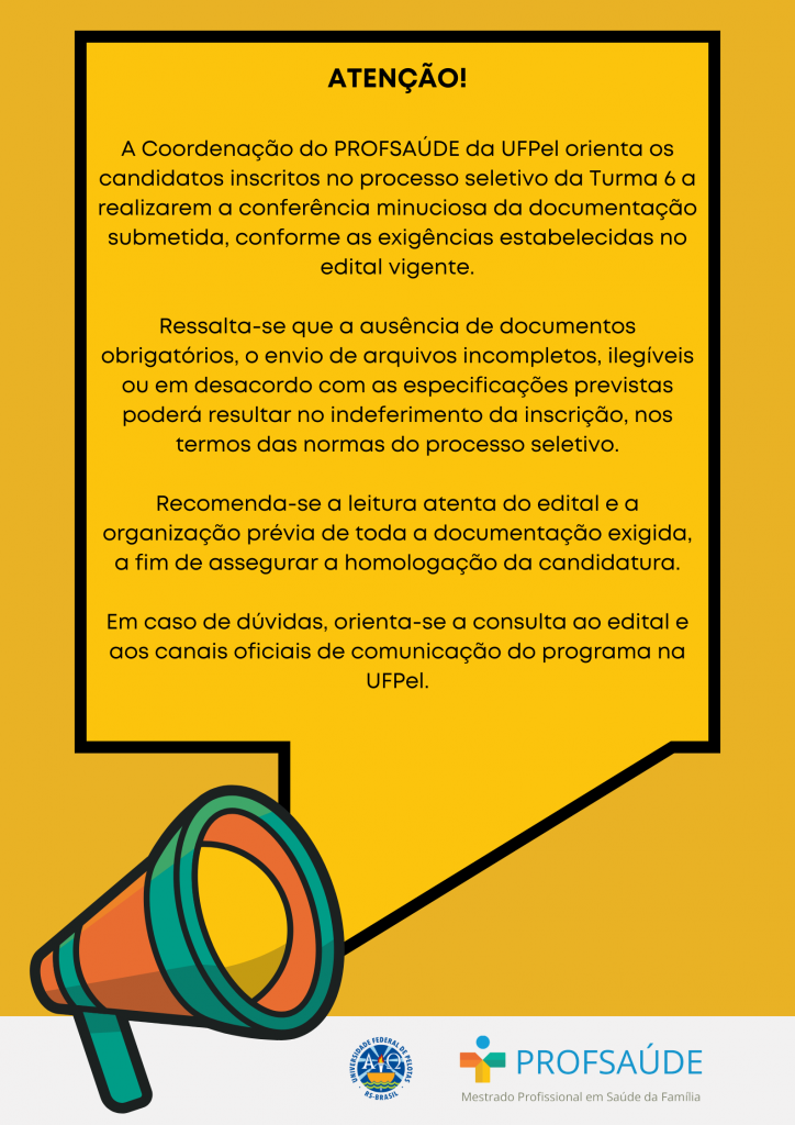 Orientações aos candidatos – PROFSAÚDE TURMA 6 Postado em 15 de fevereiro de 2026 por redator ufpel Postado em Sem categoria Acesse aqui o edital para maiores informações!