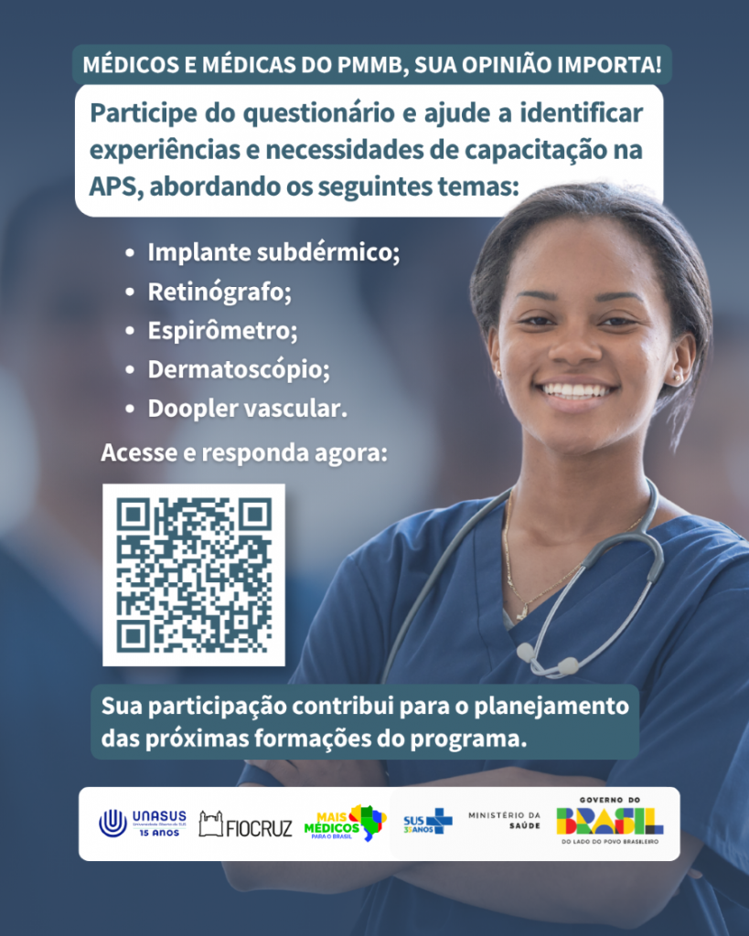 A Coordenação-Geral de Formação e Inovação para o Provimento Profissional está realizando um breve levantamento para identificar a experiência prévia e as necessidades de capacitação dos profissionais do Programa em temas estratégicos para a qualificação da Atenção Primária à Saúde.